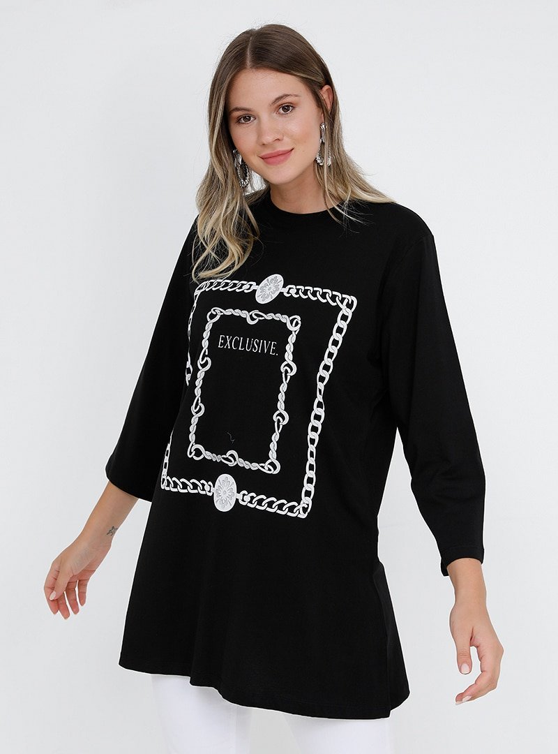 Alia Siyah Doğal Kumaşlı Baskılı Tunik
