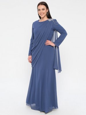 Sevdem Abiye Sevdem Üzeri Tül Detaylı Omuzu Taşlı Elbise İndigo