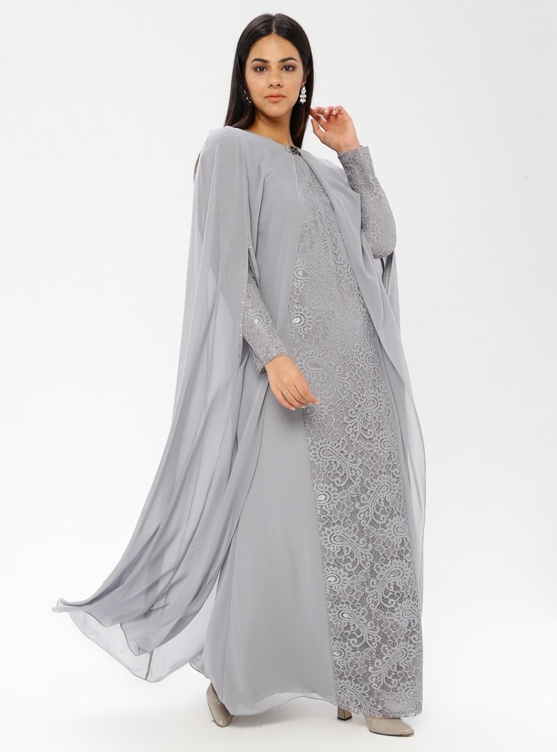 Sevdem Abiye Gri Şifon Yelekli Dantelli Abiye Elbise