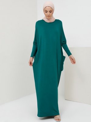 Benin Koyu Yeşil Doğal Kumaştan Salaş Elbise