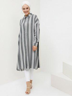 Benin Siyah Ekru Doğal Kumaşlı Gizli Düğmeli Tunik