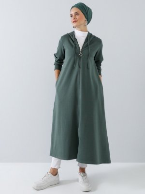 Benin Orman Yeşili Kapüşon Detaylı Fermuarlı Spor Pardesü