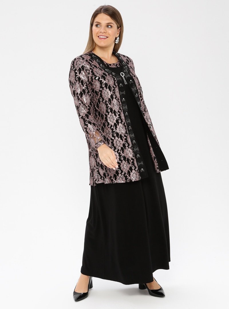 Metex Pudra Broşlu Dantelli Abiye Ceket & Elbise