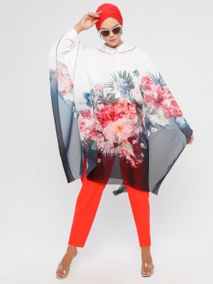 Meryem Acar Buz Mavisi Çiçek Desenli Şifon Panço