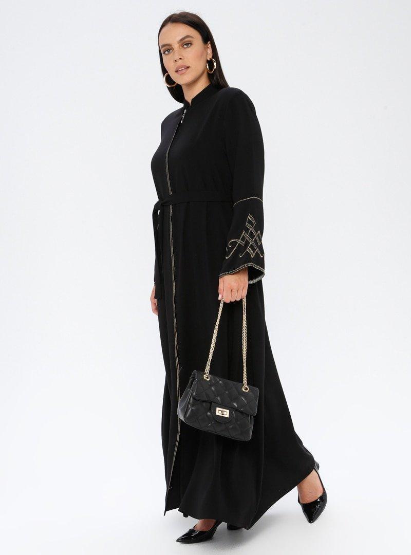 Jamila Siyah Nakış Detaylı Fermuarlı Ferace