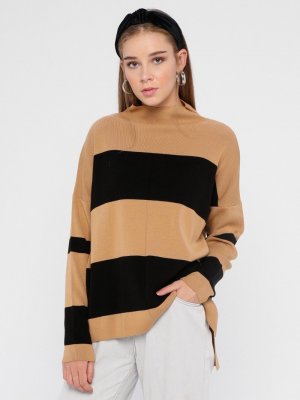Zentoni Camel Siyah Çizgili Triko Kazak
