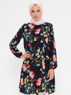 Ginezza Lacivert Mint Çiçek Desenli Tunik