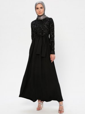 Filizzade Siyah Flok Baskılı Abiye Elbise
