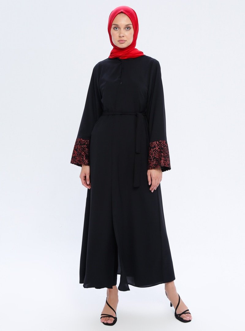 Filizzade Siyah Bordo Kolları Pul İşlemeli Ferace