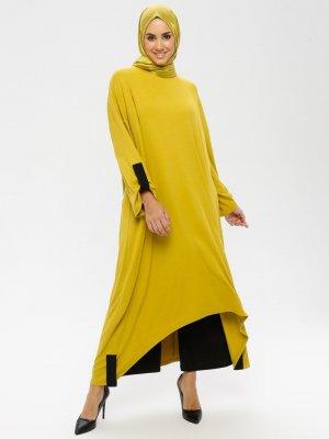Peker Safran Kontrast Manşetli Fitilli Asimetrik Elbise