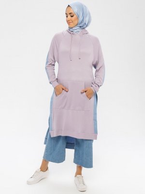 Peker Açık Lila Blok Renkli Kapüşonlu Tunik