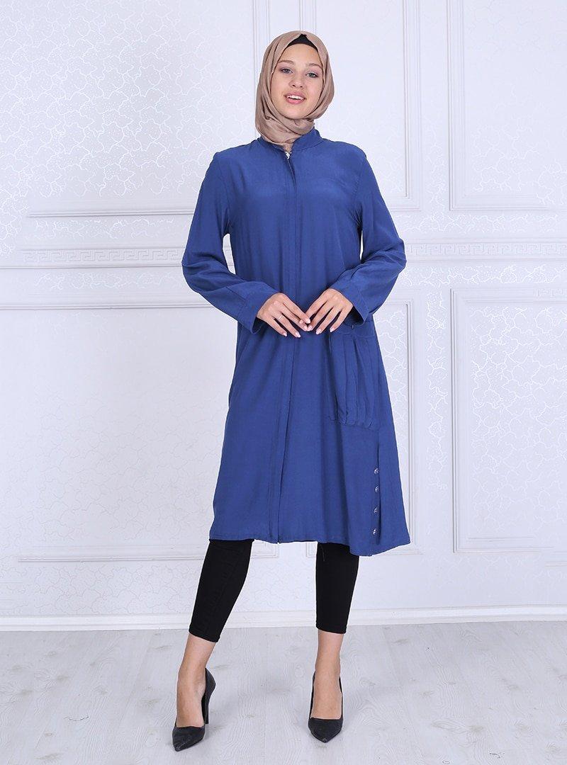 Night Blue Collection Saks Cep Detaylı Pardesü