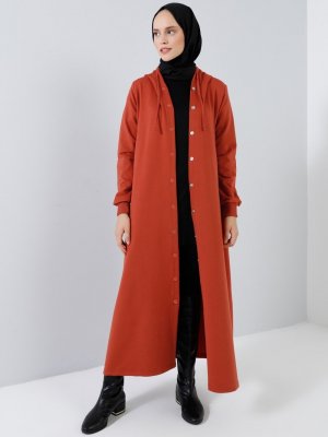 Benin Kiremit Kapüşon Detaylı Çıtçıtlı Spor Pardesü