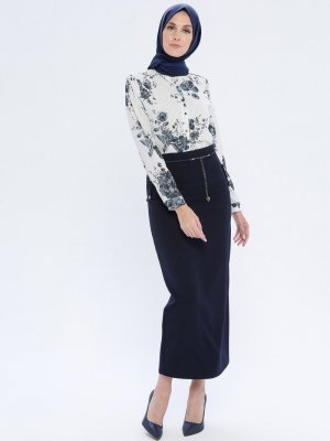 APSEN Lacivert Aksesuar Detaylı Dantelli Kalem Etek