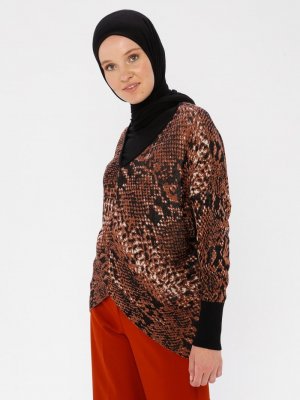 Nisan Triko Kiremit Yılan Derisi Desenli Asimetrik Triko Kazak