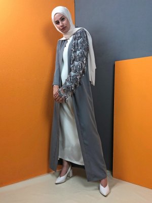 Aydazen Gri Tek Tarafı Saçaklı Abaya