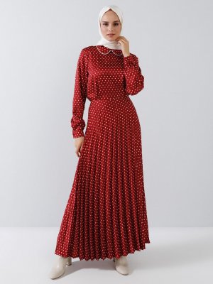Benin Bordo Pileli Puantiye Desenli Etek