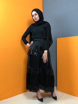 Aydazen Siyah Kat Kat Payetli Etek