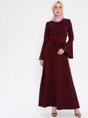 BÜRÜN Koyu Vişne Güpür Detaylı Elbise
