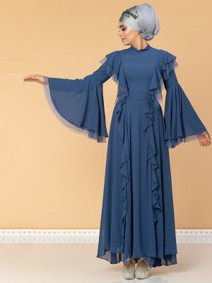 Moda Ravza İndigo Fırfırlı Tüllü Abiye Elbise