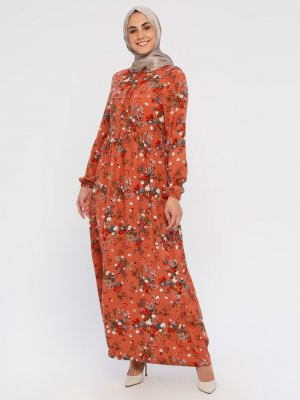 ECESUN Gül kurusu Beli Lastikli Çiçek Desenli Elbise
