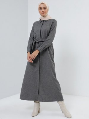 Benin Gri Boydan Gizli Düğmeli Cep Detaylı Elbise