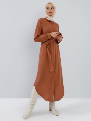Benin Koyu Tarçın Doğal Kumaşlı Gizli Düğmeli Tunik Elbise