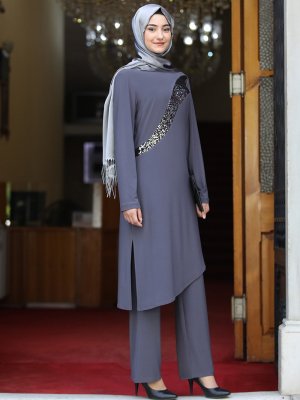 Rabeysa Gri Yaprak İkili Takım Elbise