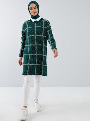 Benin Orman Yeşili Kareli Küçük Puantiyeli Triko Tunik