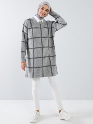 Benin Gümüş Melanj Kareli Küçük Puantiyeli Triko Tunik