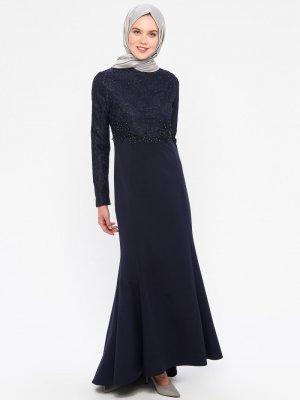 BÜRÜN Lacivert Dantelli İncili Abiye Elbise