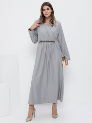 Alia Gümüş Beli Taşlı Kruvaze Yaka Elbise