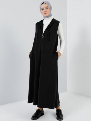 Benin Siyah Cep Detaylı Kapüşonlu Uzun Yelek