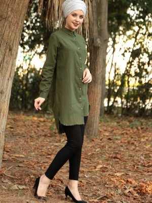 Por La Cara Koyu Haki Eteği Püsküllü Cepli Gömlek