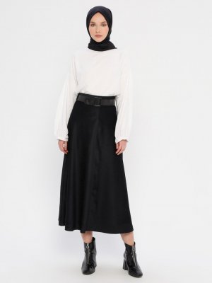 Panaline Siyah Kemer Detaylı Kadife Etek