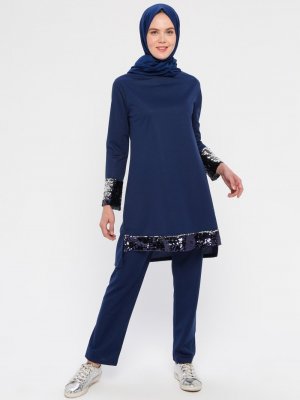 La Giza Fashion İndigo Pul Payet Detaylı Tunik&Pantolon İkili Takım