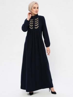 Ginezza Koyu Lacivert Kolu Lastik Detaylı Elbise