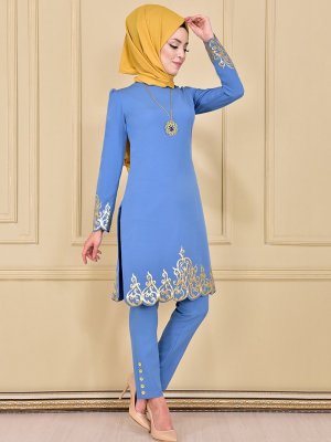 AYŞE MELEK TASARIM Mavi Gold Aplike Tunik & Pantolon İkili Abiye Elbise Takım