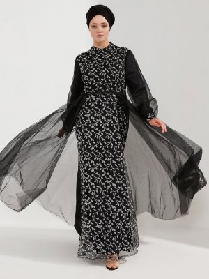 Nesrin Emniyetli Siyah Gümüş Tül Ekli Sarmaşık Abiye Elbise
