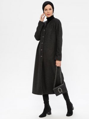 Meryem Acar Siyah V Yaka Önden Düğmeli Cepli Kap