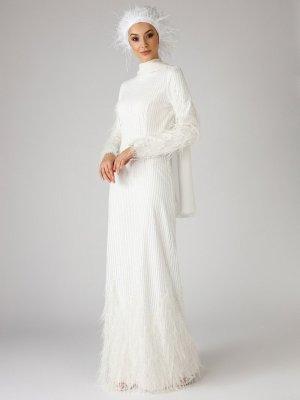 Mwedding Ekru İncili Tüylü Abiye Elbise