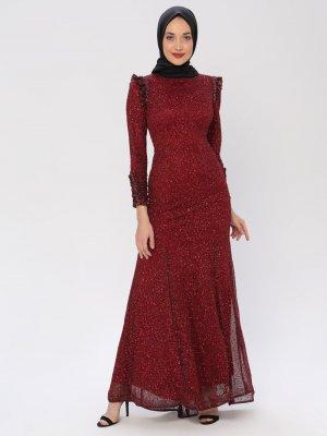 Mileny Bordo Pul Detaylı Abiye Elbise