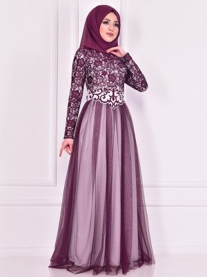 AYŞE MELEK TASARIM Gri Mürdüm Kemerli Taşlı Abiye Elbise
