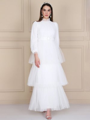 Lady Huri Beyaz Kemerli Kat Tüllü Abiye Elbise
