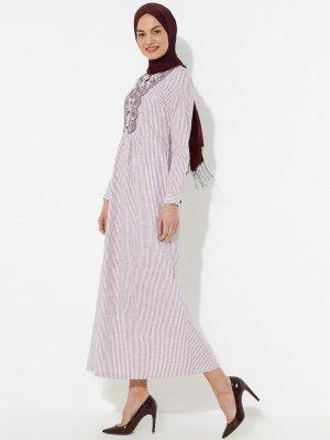 Ginezza Kırmızı Düğme Detaylı Çizgili Elbise