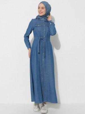 İLMEK TRİKO Mavi Boydan Düğmeli Kot Elbise