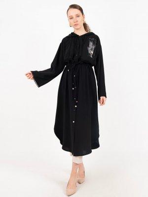 Puane Siyah Kapüşonlu Belden Büzgülü Kap