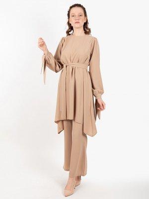 Loreen By Puane Bej Asimetrik Kuşaklı Tunik&Pantolon İkili Takım