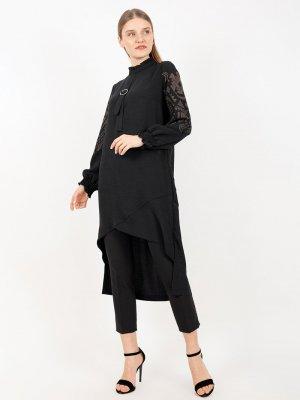 Puane Siyah Asimetrik Kesim Baskılı Tunik
