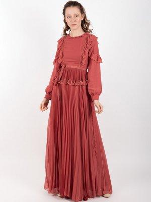 Puane Mercan Piliseli Dantelli Şifon Elbise